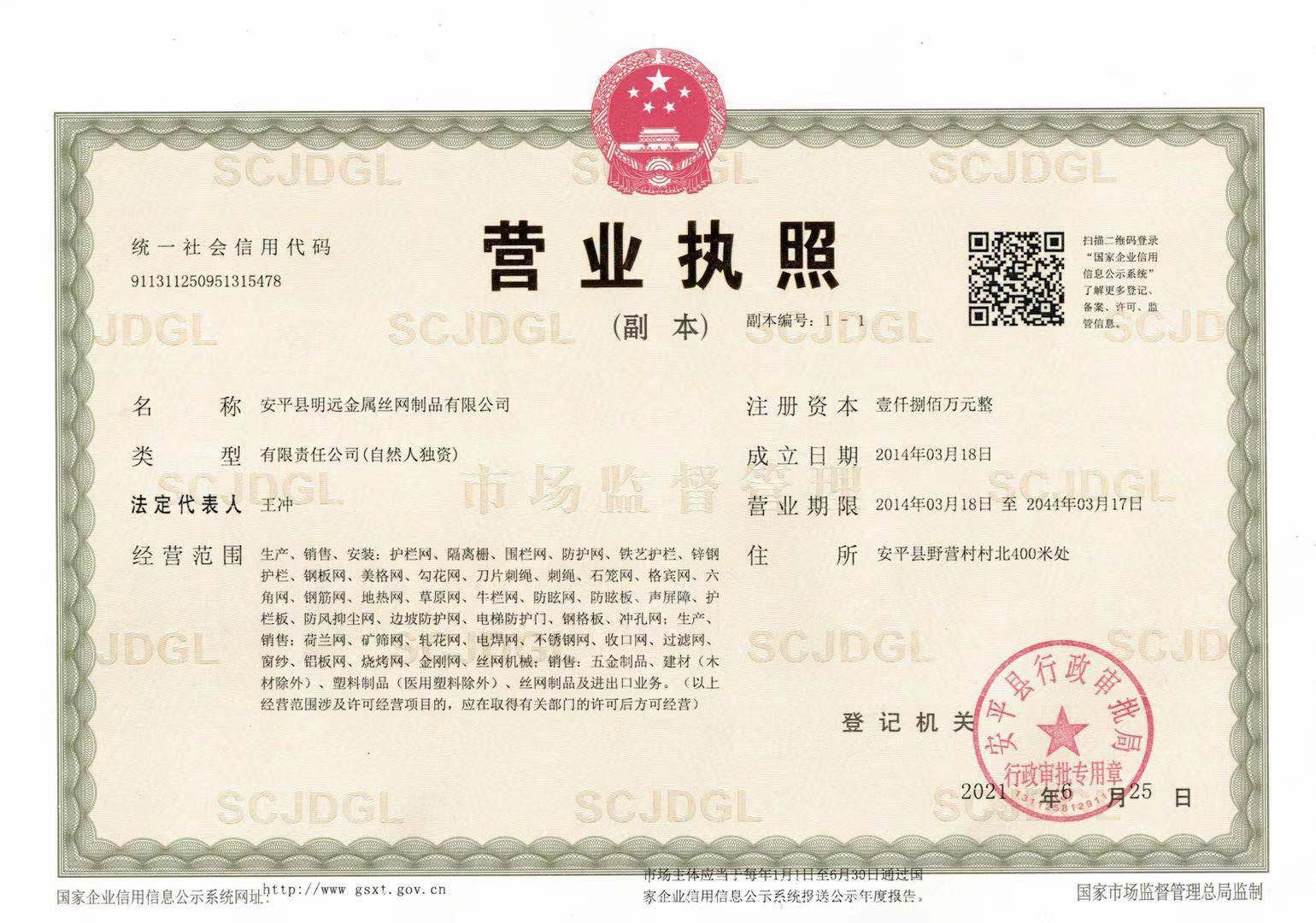 安平縣明遠金屬絲網制品有限公司 - 座落于絲網產業(yè)基地河北安平,二十年絲網制作經驗,是一家從拔絲、焊接、打砂、折彎、鍍鋅、噴塑、浸塑、為成品,生產研發(fā)安裝為一體的交通工程護欄網、光伏景區圍欄網專業(yè)型企業(yè)。明遠公司擁有先進的生產設備,全自動浸塑、噴塑、鍍鋅生產線,電腦焊網機組,聯合壓力機,數控折彎機,槍尖沖孔機等多臺輔助設備,具有大批量生產能力。